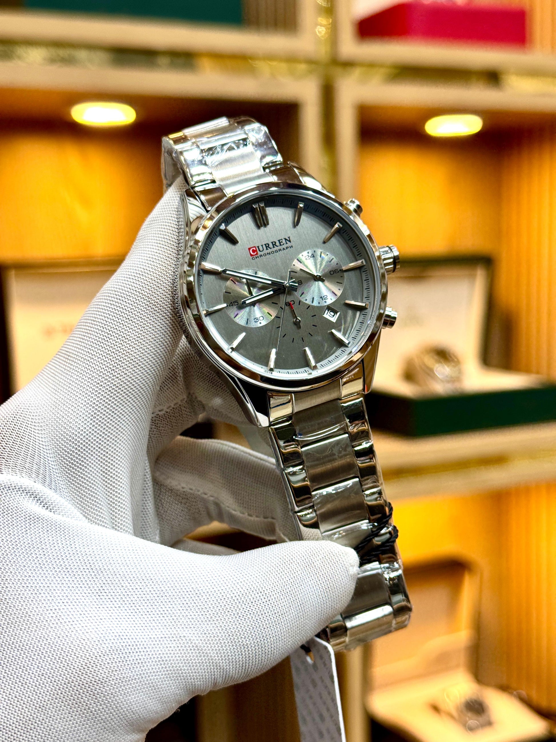 CURREN original Quartz movement delivers precision timekeeping with sophisticated chronograph functionality. The robust metal strap features a secure master lock mechanism, ensuring reliable wearability. Meticulously crafted with exceptional attention to detail, this timepiece exhibits superior quality and immaculate finishing that watch connoisseurs will appreciate. The limited availability of these premium watches makes them a coveted addition to any collection. Each piece represents