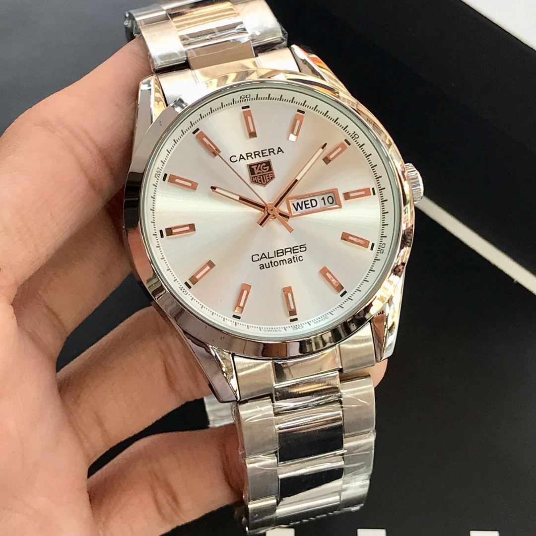 The TAG HEUER Mens Watch Calibre 5 model combines exceptional craftsmanship with superior functionality. With its precise quartz machine, you can trust in accurate timekeeping. Crafted with fine quality materials, this heavy-weight watch features a day and date function and a stainless steel chain with a master lock. Available in 3 different colors, it's the perfect combination of style and practicality.